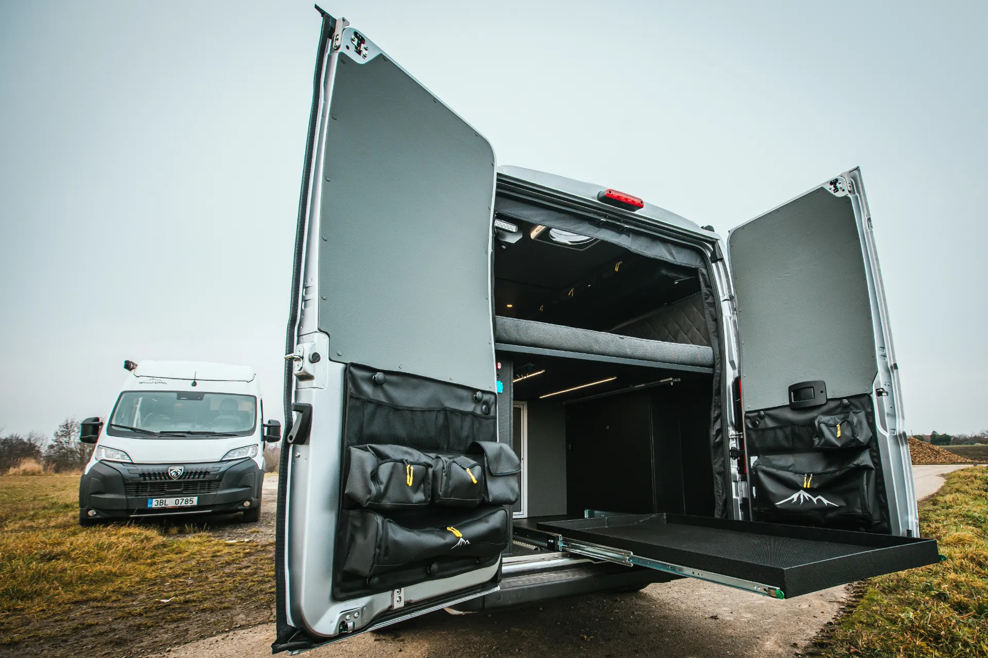 Garáž, která počítá s realitou cestování. Je vyhřívaná a prostorná, připravená na kola, mokré boty i zbytek výbavy. Když se vrátíte z výletu špinaví, přijde vhod přímý vývod na vodu z 100l nádrže. Všechno opláchnete rovnou na místě a nemusíte nic řešit. Díky výsuvnému dnu (volitelná výbava) je manipulace s nákladem hračka.