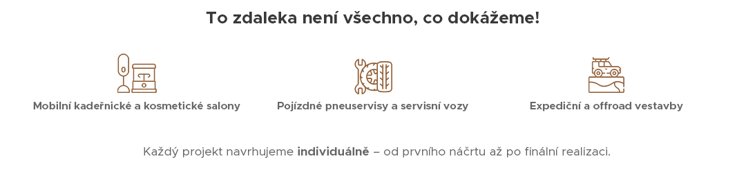 Žádný problém! Kromě našich osvědčených vestaveb vyrábíme také vestavby na míru přesně podle vašich představ. Potřebujete mobilní showroom, speciální pracovní vůz nebo netradiční úpravu pro vaše podnikání? Postaráme se o to, aby vše nejen dobře vypadalo, ale taky skvěle sloužilo.